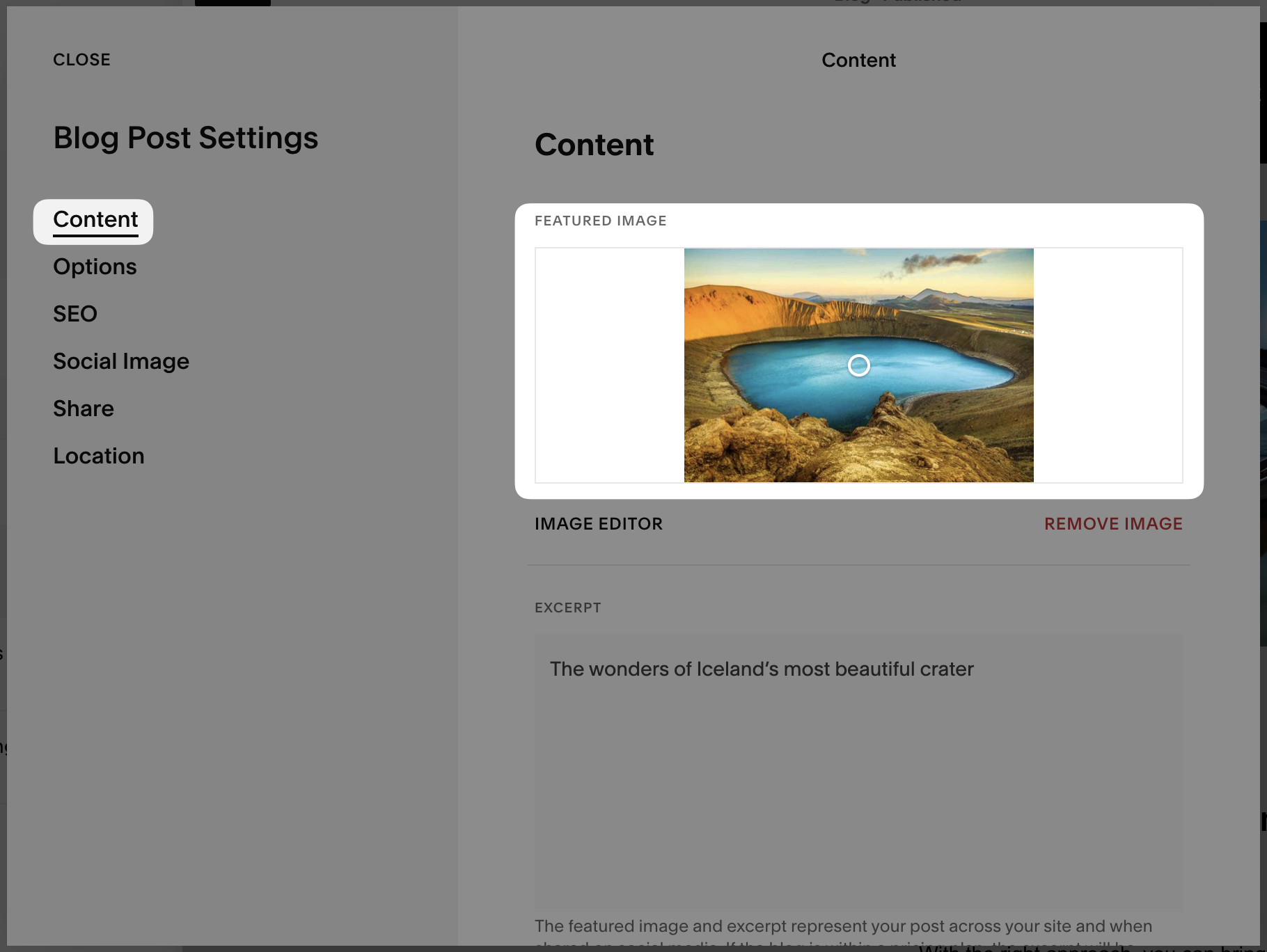 - For a blog page: we show the "Featured Image", which you can find in your Squarespace interface under Blog Post Settings. If no Feature Image is set, we'll show the "Social Image" (see below), and if that is also not set, we'll show the first valid image we can find on the page.