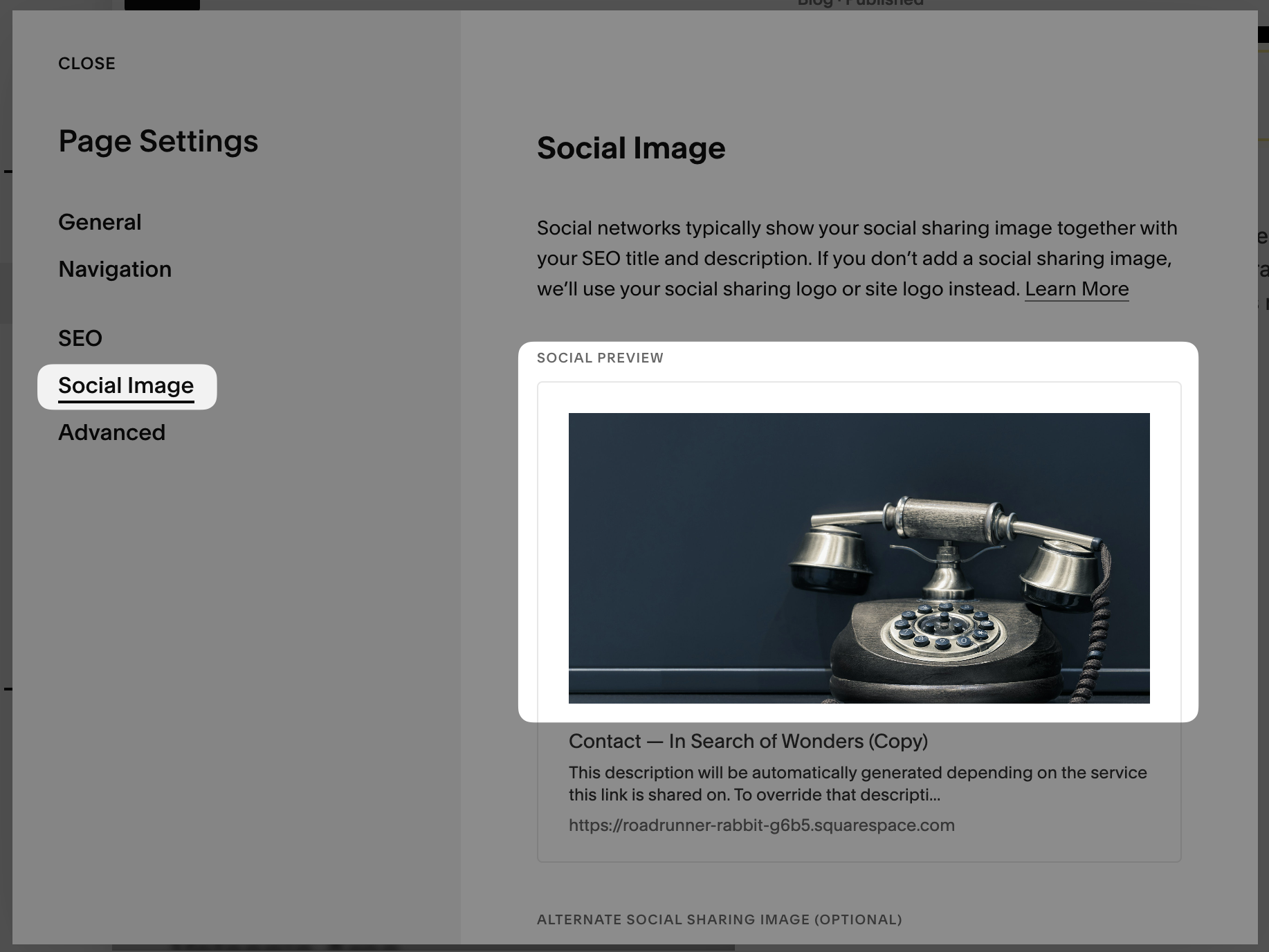 - For a regular page, we show the "Social Image", which you can find in your Squarespace interface under Page Settings. If no Social Image is set, we'll show the first valid image we can find on the page.